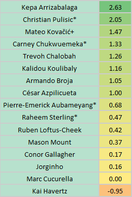 Najgori je ponovno bio Havertz (-0.95). Sada je uvjerljivo prvi po broju negativnih ocjena ove sezone, čak 8 dok nitko drugi nema ni 6… te dijeli prvo mjesto s Jorginhom po broju zadnjih mjesta u ocjenama. Vrijeme je za klupu…
