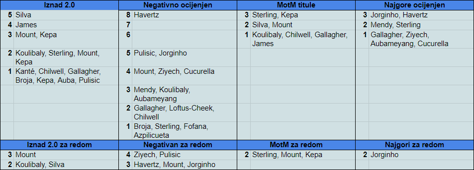 Bila je ovo jedna od onih 0-0 utakmica kada nitko živ ne zna kako je ostalo 0-0. Bilo je tu prilika na sve strane, te premda je remi pošten ishod utakmice, sam rezultat je trebao biti bliže 3-3 nego ovih 0-0. Sama činjenica da je Kepa s ocjenom 2.63 (opet) igrač utakmice potvrđuje tu izjavu. Kepa se time izjednačio sa Sterlingom na prvom mjestu po ovosezonskim titulama igrača utakmice (3), a još od prošle utakmice je vodeći u ukupnom poretku za ovu sezonu (po prosječnoj ocjeni). Kepa reborn se nastavlja!