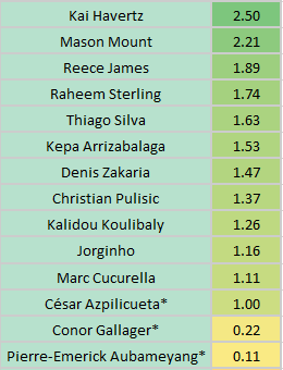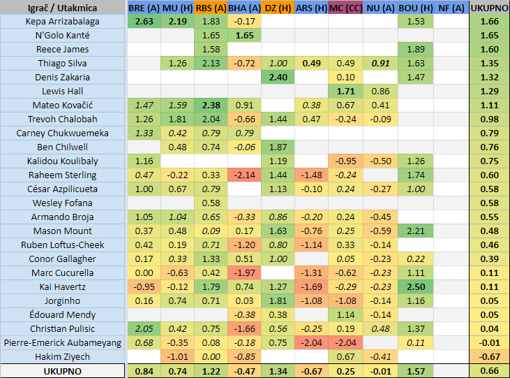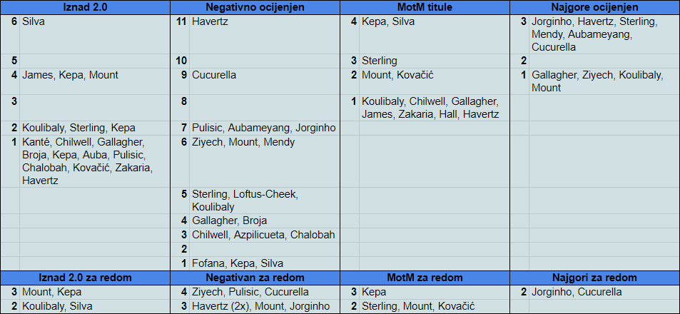 CheCro igrač utakmice po prvi(!) put ove sezone sa svojom prvom odličnom ocjenom(!) je Kai Havertz (2.50). Nastavlja li on svoju tradiciju da je znatno bolji u drugom dijelu sezone? Ne bismo se žalili! Sudjelovao je u oba gola, prvog je zabio na asistenciju Sterlinga (1.74), a drugog je asistirao za odličan šut Mounta (2.21). Havertz je sada već u mini golgeterskom nizu. Naime, u zadnjoj utakmici Njemačke na Svjetskom prvenstvu zabio je 2 gola Kostariki, a u međuvremenu čak 3 gola u zatvorenoj prijateljskoj utakmici protiv Brentforda tokom ‘priprema’ pred nastavak Premier lige. Jesmo li ipak prerano otpisali Havertza kao (lažnu) devetku? Na njemu je da dokaže da jesmo…