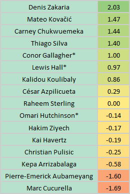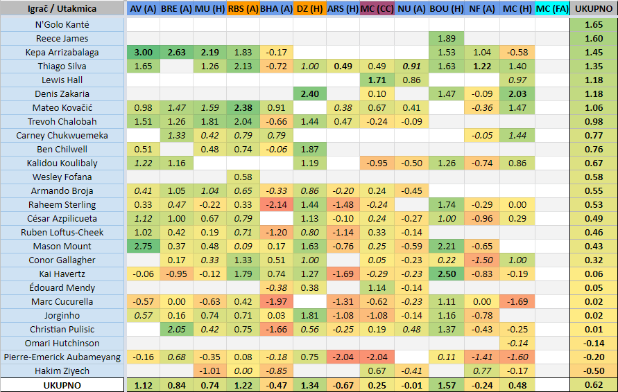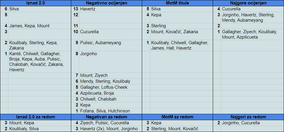 I nisu mladići bili loši. Carney Chukwuemeka (1.44) ušao je u igru već u 19. minuti kada se ozlijedio Pulisic i bio vrlo dobar i inventivan na poziciji lijevog krila. Od svih naših igrača upravo je on bio najbliži golu kada je njegov (doduše malko odbijeni) udarac odsjeo na vratnici krajem tog prvog poluvremena. Drugi najbliži? – Drugi tinejdžer, Lewis Hall (0.97)! Iznad njegovog su uma vjerojatno letjeli helikopteri kada je u sudačkoj nadoknadi utakmice promašio priliku za izjednačenje, s obzirom da se već jednom wernerovski napromašivao upravo protiv Cityja. Bilo je to u Liga kupu prije par mjeseci, a sutradan će u FA kupu imati priliku za treću sreću da im zabije. Nesumnjivo će tu priliku i dobiti, s obzirom ne samo na popis ozlijeđenih, već i njegove, unatoč promašajima, konzistentno dobre nastupe kad god zaigra. Treći mladac, Omari Hutchinson (-0.14) nas i nije baš impresionirao, poglavito ne u usporedbi sa svojim kolegama. Nema veze, on je jedini od ove trojice kojemu je to bio debi, tako da ćemo mu dati ‘benefit of the doubt‘. Ostvariti prvi nastup u seniorskoj karijeri nikada nije lak zadatak, a kamoli kada je to protiv Pepovog Cityja.