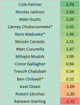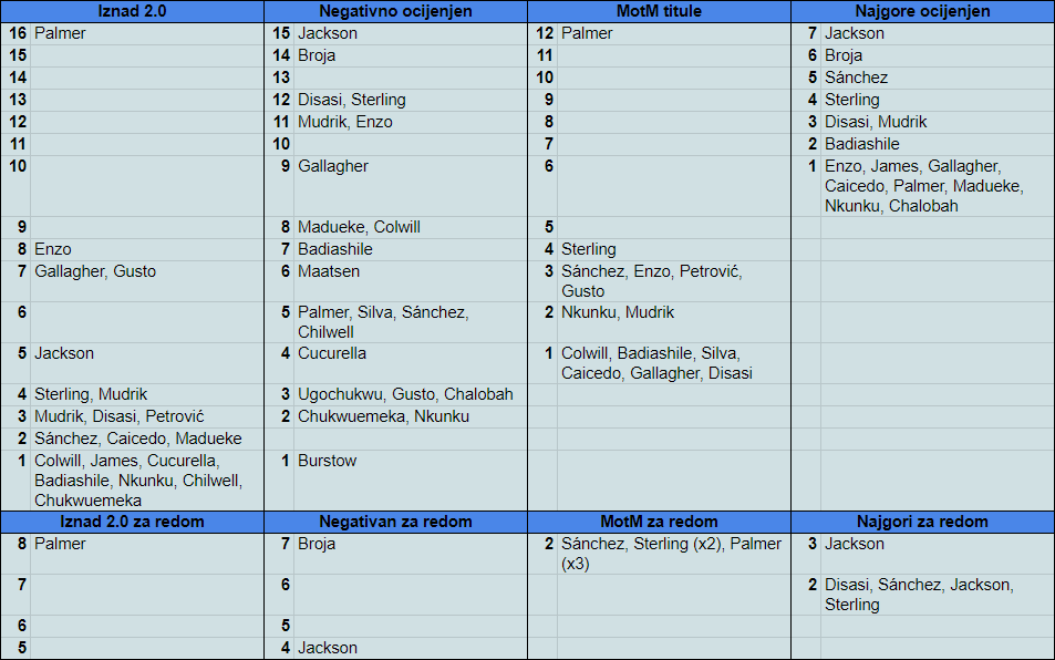 O Palmeru (2.74) ne treba puno pričati. Ovo mu je drugi MotM za redom, a oba puta je bio iznad 2.7(!) uz gol i asistenciju. Trenutno ove sezone ima dvostruko više odličnih ocjena od svih drugih te čak trostruko više MotM titula od ostalih (vidi tablicu ispod). U ovoj je zabio ono što je trebala biti potvrda pobjede za 2-0, ali je onda Disasi (-1.09) bizarnim autogolom vratio goste u igru. Unatoč tome Disasi je tek treći najgore ocijenjeni igrač, što puno govori o nastupima zahrđalog i nesigurnog Sáncheza (-1.20) i Sterlinga (-2.72). Sterlingu je, obrnuto nego Palmeru, ovo druga utakmica da je najgore ocijenjen. U ovoj utakmici je, osim asistencije za drugi gol, apsolutno SVE kiksao, uključujući penal.