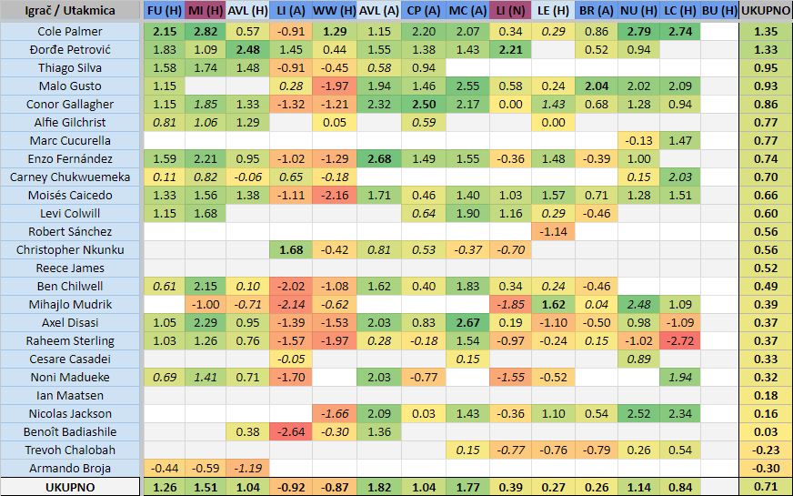 Ako jest, to je zato što je prošlu utakmicu bio praktički isti. Odlične (2+) ocjene dobili su redom Palmer, Jackson, Mudrik i Gusto, a ovog puta je Mudrik (1.09) dobio ‘samo’ dobru (1+) ocjenu, dok se među odlične ugurao matchwinner s klupe, Chukwuemeka (2.03). Malo je za 2+ nedostajalo i drugom strijelcu Maduekeu (1.94).