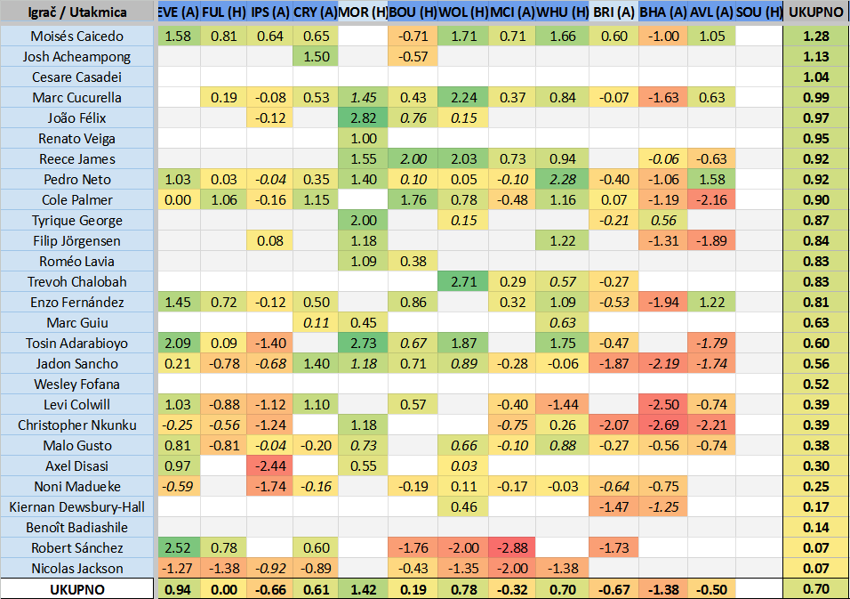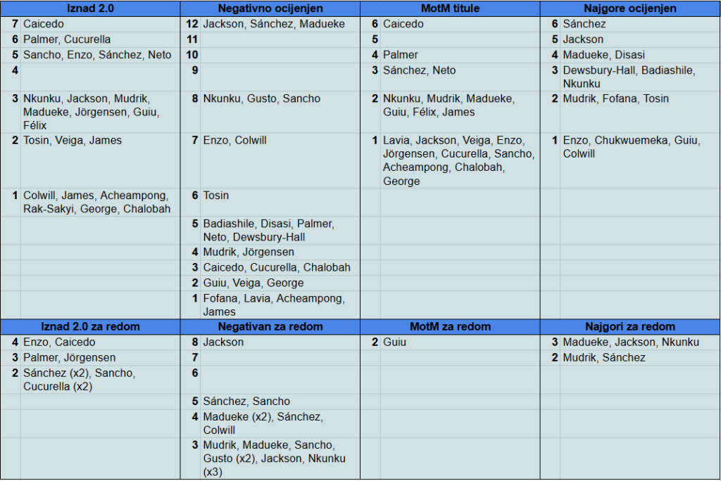 Najgora trojica bili su Jörgensen (-1.89) koji je na samom kraju utakmice (doslovno) prosuo taj 1 bod i poklonio domaćinima pobjedu, Palmer (-2.16) koji je prije toga promašio odličnu priliku za našu pobjedu te mu je ovo daleko, daleko najgora ocjena od dolaska u klub, te ponovno potpuno nevidljivi Nkunku (-2.21), 3. utakmicu za redom naš najgori igrač, sve redom ispod -2… Pa zar nije bolje da igra George?!